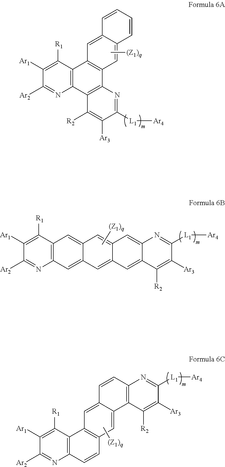 In Formulae 4A to 4H, 5A to 5F, 6A to 6F, 7A to 7F, 8A to 8F, 9A and 9B, 10A to 10F, 11A and 11B, 12A and 12B, and 13A and 13B, Ar1, Ar2, Ar3 and Ar4 may be each independently a hydrogen atom, a deuterium atom, a halogen atom, a hydroxyl group, a cyano group, a nitro group, a carboxyl group, a silyl group, a substituted or unsubstituted C1-C50 alkyl group, a substituted or unsubstituted C2-C50 alkenyl group, a substituted or unsubstituted C2-C50 alkynyl group, a substituted or unsubstituted C1-C50 alkoxy group, a substituted or unsubstituted C3-C50 cycloalkyl group, a substituted or unsubstituted C3-C50 cycloalkenyl group, a substituted or, unsubstituted C5-C60 aryl group, a substituted or unsubstituted C5-C60 aryloxy group, a substituted or unsubstituted C5-C60 arylthio group, a substituted or unsubstituted C2-C60 heteroaryl group, a substituted or unsubstituted fused polycyclic group, a group represented by N(Q1)(Q2), or a group represented by Si(Q3)(Q4)(Q5) (wherein Q1 to Q5 may be each independently a hydrogen atom, a deuterium atom, a halogen atom, a hydroxyl group, a cyano group, a nitro group, a carboxyl group, a silyl group, a substituted or unsubstituted C1-C50 alkyl group, a substituted or unsubstituted C2-C50 alkenyl group, a substituted or unsubstituted C2-C50 alkynyl group, a substituted or unsubstituted C1-C50 alkoxy group, a substituted or unsubstituted C3-C50 cycloalkyl group, a substituted or unsubstituted C3-C50 cycloalkenyl group, a substituted or unsubstituted C5-C60 aryl group, a substituted or unsubstituted C5-C60 aryloxy group, a substituted or unsubstituted C5-C60 arylthio group, a substituted or unsubstituted C2-C60 heteroaryl group, a substituted or unsubstituted C2-C60 fused polycyclic group, or a combination thereof.) From among Ar1 to Ar4, adjacent two or more thereof may be bonded to form a saturated or unsaturated ring.