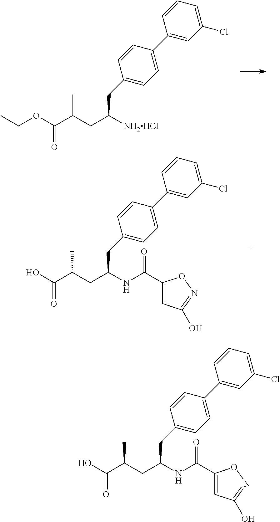 Next, to a solution of (E)-(R)-4-tert-butoxycarbonylamino-5-(3′-chloro-biphenyl-4-yl)-2-methyl-pent-2-enoic acid ethyl ester (2.5 g, 5.63 mmol) in ethanol (20 mL) is added Pt/C (250 mg) and the mixture is stirred overnight under an atmosphere of hydrogen (H2 balloon). The catalyst is filtered through a Celite pad and, the filtrate is concentrated to give (S)-4-tert-butoxycarbonylamino-5-(3′-chloro-biphenyl-4-yl)-2-methyl-pentanoic acid ethyl ester.
