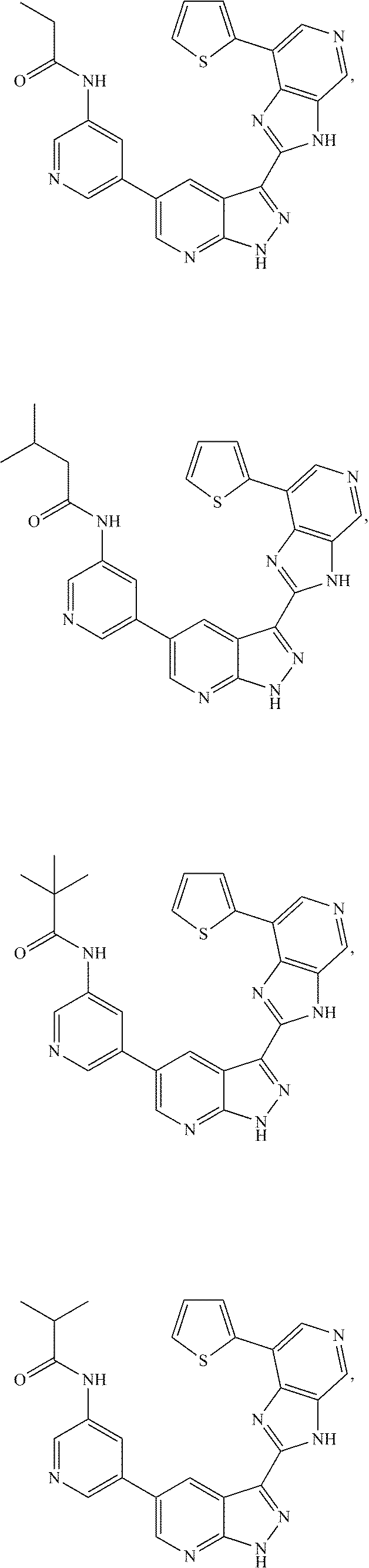 - UULSCUGHSCNFPF-UHFFFAOYSA-N CC(=O)C1=CC=C(C2=CN=CC3=C2N=C(C2=NNC4=NC=C(C5=CN=CC(NC(=O)C(C)(C)C)=C5)C=C42)N3)S1.CC(=O)C1=CC=C(C2=CN=CC3=C2N=C(C2=NNC4=NC=C(C5=CN=CC(NC(=O)C(C)C)=C5)C=C42)N3)S1.CC(=O)C1=CC=C(C2=CN=CC3=C2N=C(C2=NNC4=NC=C(C5=CN=CC(NC(=O)CC(C)C)=C5)C=C42)N3)S1.CCC(=O)NC1=CC(C2=CN=C3NN=C(C4=NC5=C(C=NC=C5C5=CC=C(C(C)=O)S5)N4)C3=C2)=CN=C1 Chemical compound CC(=O)C1=CC=C(C2=CN=CC3=C2N=C(C2=NNC4=NC=C(C5=CN=CC(NC(=O)C(C)(C)C)=C5)C=C42)N3)S1.CC(=O)C1=CC=C(C2=CN=CC3=C2N=C(C2=NNC4=NC=C(C5=CN=CC(NC(=O)C(C)C)=C5)C=C42)N3)S1.CC(=O)C1=CC=C(C2=CN=CC3=C2N=C(C2=NNC4=NC=C(C5=CN=CC(NC(=O)CC(C)C)=C5)C=C42)N3)S1.CCC(=O)NC1=CC(C2=CN=C3NN=C(C4=NC5=C(C=NC=C5C5=CC=C(C(C)=O)S5)N4)C3=C2)=CN=C1 UULSCUGHSCNFPF-UHFFFAOYSA-N 0.000 description 2
