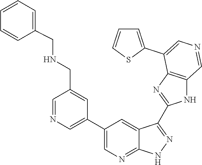 - DWMFUXLRKHLXHA-UHFFFAOYSA-N C1=CC2=C(C=N1)NC(C1=NNC3=NC=C(C4=CN=CC(CNCC5CCCC5)=C4)C=C31)=N2.CC(=O)C1=CC=C(C2=CN=CC3=C2N=C(C2=NNC4=NC=C(C5=CN=CC(CNCC6=CC=CC=C6)=C5)C=C42)N3)S1.CC1=CC=C(C2=CN=CC3=C2N=C(C2=NNC4=NC=C(C5=CN=CC(CNCC6=CC=CC=C6)=C5)C=C42)N3)S1.FC1=CC=C(C2=CN=CC3=C2N=C(C2=NNC4=NC=C(C5=CN=CC(CNCC6=CC=CC=C6)=C5)C=C42)N3)S1 Chemical compound C1=CC2=C(C=N1)NC(C1=NNC3=NC=C(C4=CN=CC(CNCC5CCCC5)=C4)C=C31)=N2.CC(=O)C1=CC=C(C2=CN=CC3=C2N=C(C2=NNC4=NC=C(C5=CN=CC(CNCC6=CC=CC=C6)=C5)C=C42)N3)S1.CC1=CC=C(C2=CN=CC3=C2N=C(C2=NNC4=NC=C(C5=CN=CC(CNCC6=CC=CC=C6)=C5)C=C42)N3)S1.FC1=CC=C(C2=CN=CC3=C2N=C(C2=NNC4=NC=C(C5=CN=CC(CNCC6=CC=CC=C6)=C5)C=C42)N3)S1 DWMFUXLRKHLXHA-UHFFFAOYSA-N 0.000 description 2