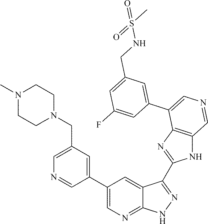 - SYEMPVBXDBIYLE-UHFFFAOYSA-N FC1=CC(C2=CN=CC3=C2N=C(C2=NNC4=NC=C(C5=CC=CN=C5)C=C42)N3)=CC(CN2CCCC2)=C1 Chemical compound FC1=CC(C2=CN=CC3=C2N=C(C2=NNC4=NC=C(C5=CC=CN=C5)C=C42)N3)=CC(CN2CCCC2)=C1 SYEMPVBXDBIYLE-UHFFFAOYSA-N 0.000 description 4