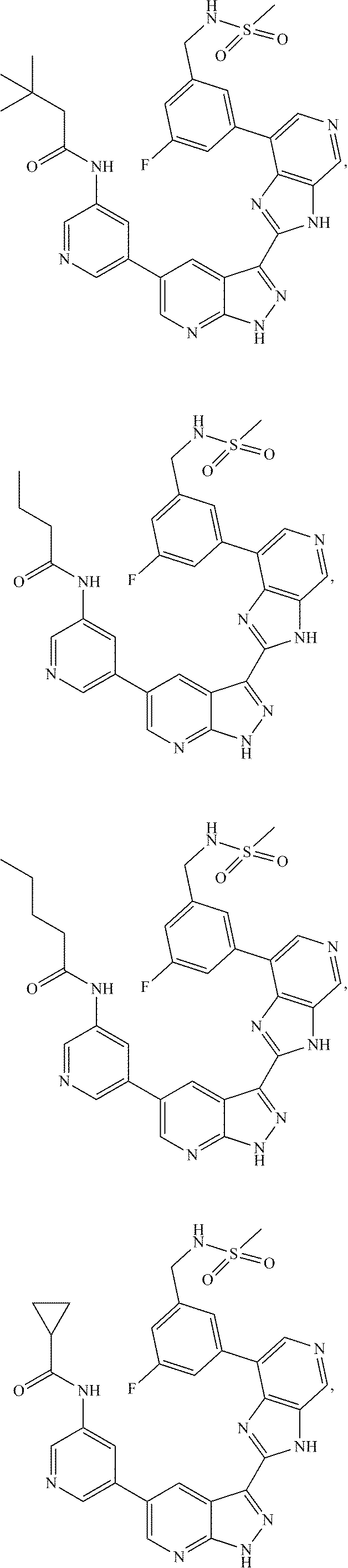 - DCIYAZAWKCTGNT-UHFFFAOYSA-N CC(C)(C)C(=O)NC1=CC(C2=CN=C3NN=C(C4=NC5=C(C=NC=C5C5=C(F)C=CC=C5)N4)C3=C2)=CN=C1.FC1=CC=C(C2=CN=CC3=C2N=C(C2=NNC4=NC=C(C5=CN=CC(CN6CCC(F)(F)C6)=C5)C=C42)N3)C=C1.O=C(CC1=CC=CC=C1)NC1=CC(C2=CN=C3NN=C(C4=NC5=C(C=NC=C5C5=C(F)C=CC=C5)N4)C3=C2)=CN=C1.O=C(NC1=CC(C2=CN=C3NN=C(C4=NC5=C(C=NC=C5C5=C(F)C=CC=C5)N4)C3=C2)=CN=C1)C1=CC=CC=C1 Chemical compound CC(C)(C)C(=O)NC1=CC(C2=CN=C3NN=C(C4=NC5=C(C=NC=C5C5=C(F)C=CC=C5)N4)C3=C2)=CN=C1.FC1=CC=C(C2=CN=CC3=C2N=C(C2=NNC4=NC=C(C5=CN=CC(CN6CCC(F)(F)C6)=C5)C=C42)N3)C=C1.O=C(CC1=CC=CC=C1)NC1=CC(C2=CN=C3NN=C(C4=NC5=C(C=NC=C5C5=C(F)C=CC=C5)N4)C3=C2)=CN=C1.O=C(NC1=CC(C2=CN=C3NN=C(C4=NC5=C(C=NC=C5C5=C(F)C=CC=C5)N4)C3=C2)=CN=C1)C1=CC=CC=C1 DCIYAZAWKCTGNT-UHFFFAOYSA-N 0.000 description 2
