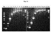 FIG. 10 is a photograph of agarose gel electrophoresis illustrating the result of Long kb PCR using lambda DNA with the dried premix containing PPi, PPase and Pfu DNA polymerase and the dried premix containing Pfu DNA polymerase only. Lane 1-lane 10 illustrate the results of Long kb PCR with the premix containing Pfu DNA polymerase. Lane 11-lane 20 illustrate the results of Long kb PCR with the premix containing 2.0 mM PPi and 80 mU PPase and Pfu DNA polymerase. Lane 1 and lane 11, lane 2 and lane 12, lane 3 and lane 13, lane 4 and lane 14, lane 5 and lane 15, lane 6 and lane 16, lane 7 and lane 17, lane 8 and lane 18, lane 9 and lane 19, and lane 10 and lane 20 indicate the PCR results with the amplified products of respectively 500 bp, 1.0 kbp, 2.0 kbp, 5.0 kbp, 8.0 kbp, 10.0 kbp, 12.0 kbp, 15.0 kbp, 20.0 kbp, and 30.0 kbp. M1 indicates 1 kb DNA size ladder marker and M2 indicates lambda/Hind III ladder marker.
