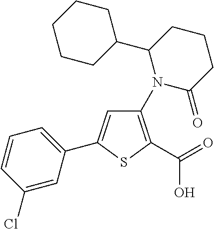 - KPXXJGLDHSJRLQ-UHFFFAOYSA-N 3-(2-cyclohexyl-6-oxopiperidin-1-yl)-5-(4-fluorophenyl)thiophene-2-carboxylic acid Chemical compound OC(=O)C=1SC(C=2C=CC(F)=CC=2)=CC=1N(C(CCC1)=O)C1C1CCCCC1 KPXXJGLDHSJRLQ-UHFFFAOYSA-N 0.000 claims description 6