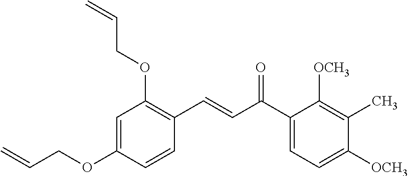 - HHBPQYXCZRGGNV-WHZNASCQSA-N C=CCOC1=CC(OCC=C)=C(C(=O)/C=C/C2=CC=C(C)C(C)=C2OC)C=C1.COC1=C(C)C(C)=CC=C1/C=C/C(=O)C1=C(OC(C)C)C=C(OC(C)C)C=C1.COC1=C(C)C(C)=CC=C1/C=C/C(=O)C1=C(OCC2=CC=CC=C2)C=C(C)C=C1.COC1=CC=C(/C=C/C(=O)C2=C(O)C=C(O)C=C2)C(OC)=C1C Chemical compound C=CCOC1=CC(OCC=C)=C(C(=O)/C=C/C2=CC=C(C)C(C)=C2OC)C=C1.COC1=C(C)C(C)=CC=C1/C=C/C(=O)C1=C(OC(C)C)C=C(OC(C)C)C=C1.COC1=C(C)C(C)=CC=C1/C=C/C(=O)C1=C(OCC2=CC=CC=C2)C=C(C)C=C1.COC1=CC=C(/C=C/C(=O)C2=C(O)C=C(O)C=C2)C(OC)=C1C HHBPQYXCZRGGNV-WHZNASCQSA-N 0.000 description 1
