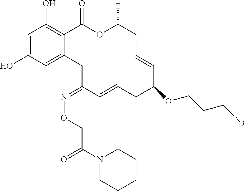 Other resorcylic acid lactones (RALs) studied in this respect include 17-allylamino-17-demethoxygeldanamycin (17AAG) (D. B. Solit et al., Clin. Cancer Res., 8:986 (2002); L. R. Kelland et al., J. Natl. Cancer Inst., 91:1940 (1999)); 17DMAG (J. L. Eiseman et al., Cancer Chemother. Pharmacol., 55:21-32 (2005)); IPI-504 (J. Ge et al., J. Med. Chem., 49:4606 (2006); oxime derivatives such as KF25706 (S. Soga, et al., Cancer Res., 59:2931 (1999)) and KF55823 (S. Soga et al., Cancer Chemotherapy and Pharmacology, 48:435 (2001)); and Danishefsky et al.'s cycloproparadicicol (A. Rivkin et al., Ibid., 44:2838 (2005)). Structurally related variants include chimeric inhibitors having radicicol's carboxyresorcinol and the geldanamycin's benzoquinone (R. C. Clevenger and B. S. Blagg, Org. Lett., 6:4459 (2004); G. Shen and B. S. Blagg, Ibid. 7:2157 (2004); G. Shen et al., J. Org. Chem., 71:7618 (2006)).