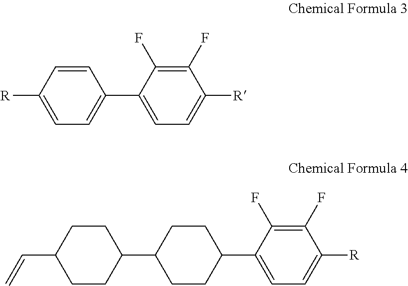 The liquid crystal composition according to the present exemplary embodiment may further include, for example, at least one of a third compound represented by, for example, the following Chemical Formula 3 and a fourth compound represented by, for example, the following Chemical Formula 4.
