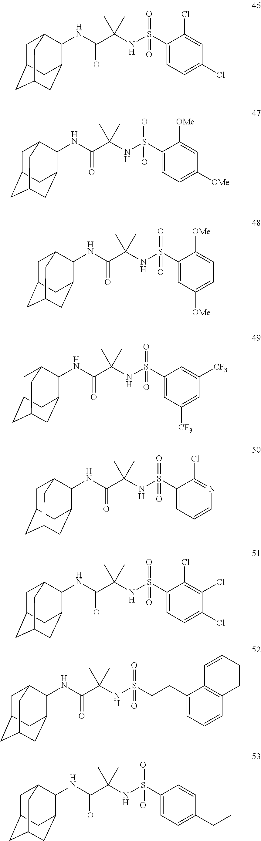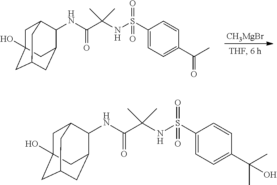 Into a 10-mL flask, methyl-2-amino-2-(phenylsulfonylamido)propionic acid (200 mg, 0.822 mmol), 2-adamantanamine hydrochloride (185 mg, 0.986 mmol), and BOP (364 mg, 0.823 mmol) were charged, and CH2Cl2 (3 ml) was charged, followed by stirring for 30 minutes at room temperature. The resultant mixture was added with DIPEA (0.35 ml, 2.01 mmol), and stirred at room temperature for 12 hours. After the reaction was completed, the organic layer was separated using CH2Cl2 and H2O, dried with MgSO4, and filtered. Then, the resultant mixture was purified with column chromatography (EA/n-Hex=1:4) so as to obtain 4-(2-methyl-2-(phenylsulfonamido)propanamido)adamantane (284 mg, 92%).