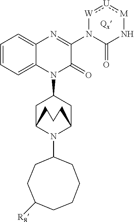 - (c) A-B can together form a (C2-C6)bridge, which is unsubstituted or substituted with 1, 2, 3, 4, 5, 6, 7 or 8 substituents independently selected from —OH, —(C1-C4)alkyl, -halo, and —C(halo)3, and which bridge optionally contains —HC═CH— or —O— within the (C2-C6)bridge; where the 6-membered, nitrogen-containing ring that is fused to the Qa ring can be in the endo- or exo-configuration with respect to the A-B bridge; or