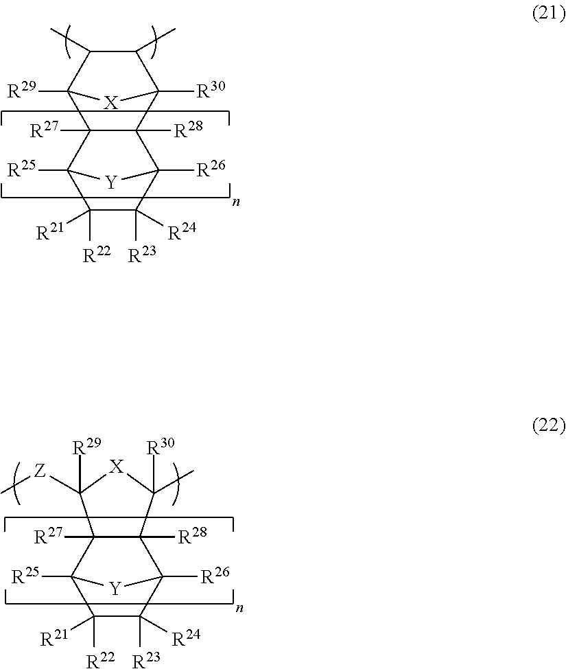 The ring structure to be contained in the recurring unit having the aliphatic polycyclic structure may be substituted with various substituents. For example, the substituents include an alkyl group (preferably having from 1 to 12 carbon atoms, more preferably from 1 to 6 carbon atoms, even more preferably from 1 to 3 carbon atoms, for example, a methyl group, an ethyl group, a propyl group, etc.), an alkoxy group (preferably having from 1 to 12; more preferably from 1 to 6, even more preferably from 1 to 3 carbon atoms, for example, a methoxy group, an ethoxy group, a propoxy group, etc.), an alkylthio group (preferably having from 1 to 12, more preferably from 1 to 6, even more preferably from 1 to 3 carbon atoms, for example, a methylthio group, an ethylthio group, etc.), a halogen atom (for example, a fluorine atom, a chlorine atom, a bromine atom, an iodine atom), a heterocyclic group (preferably having from 1 to 30, more preferably from 1 to 12 carbon atoms, and having, for example, a nitrogen atom, an oxygen atom or a sulfur atom as the hetero atom; for example, an imidazolyl group, a pyridyl group, a quinolyl group, a furyl group, a piperidyl group, a morpholino group, a benzoxazolyl group, a benzimidazolyl group, a benzothiazolyl group, etc.). These substituents may be further substituted. In case where the structure has two or more substituents, they may be the same or different. If possible, the substituents may bond to each other to form a ring. In the invention, preferred is an embodiment where the structure is substituted with an alkyl group or a halogen atom, more preferably with a halogenoalkyl group or a halogen atom, even more preferably with a perfluoroalkyl group or a fluorine atom.