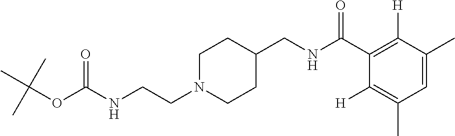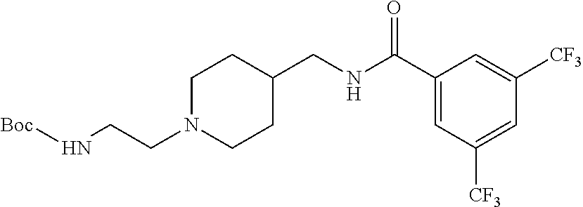 The above crude tert-butyl 1-((4-((3,5-bis(trifluoromethyl)benzamido) methyl)piperidin-1-yl)methyl)cyclopentyl carbamate dissolved in CH2Cl2 (3 mL) and TFA (2 mL) was added at room temperature. The reaction was allowed to stir at room temperature for 2 hours and then diluted with CH2Cl2 (15 mL). The organic mixture was washed with the mixture of sat. NaHCO3 (10 mL) and 2 N NaOH (5 mL), dried over Na2SO4. Removal of solvent in vacuo provided oil. The crude oil was purified by Biotage (10% MeOH in CH2Cl2) to yield N-((1-((1-aminocyclopentyl)methyl)piperidin-4-yl)methyl)-3,5-bis(trifluoromethyl)benzamide (379 mg, 56% over two steps).