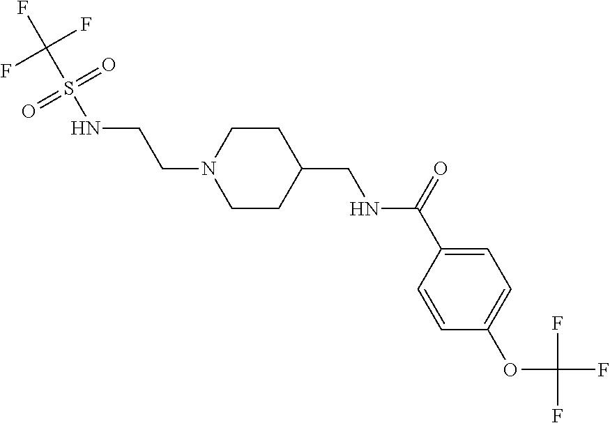 In order to be maximally useful in treatment, it is also helpful to assess the side reactions which might occur. Thus, in addition to being able to modulate a particular calcium channel, it is desirable that the compound has very low activity with respect to the hERG K+ channel which is expressed in the heart. Compounds that block this channel with high potency may cause reactions which are fatal. Thus, for a compound that modulates the calcium channel, it is preferred that the hERG channel is not inhibited. Some inhibition of the hERG K+ channel may be tolerated in a drug as long as the compound is sufficiently selective for the target of interest over the hERG K+ channel. For example, 10 fold selectivity of a T-type calcium channel over the hERG K+ channel would be beneficial and more preferably 30 fold selectivity or 100 fold selectivity.