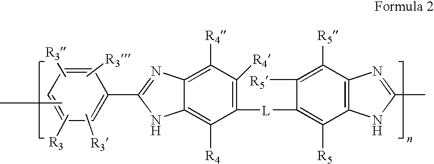 In Formulae 1 and 2, m and n represent relative molar amounts of constituent repeating units of the polyazole wherein the sum of m and n is l, m is a number from 0.01 to 1, and n is a number from 0 to 0.99. In a specific embodiment, m may be a number from 0.1 to 1, and n may be a number from 0 to 0.9.