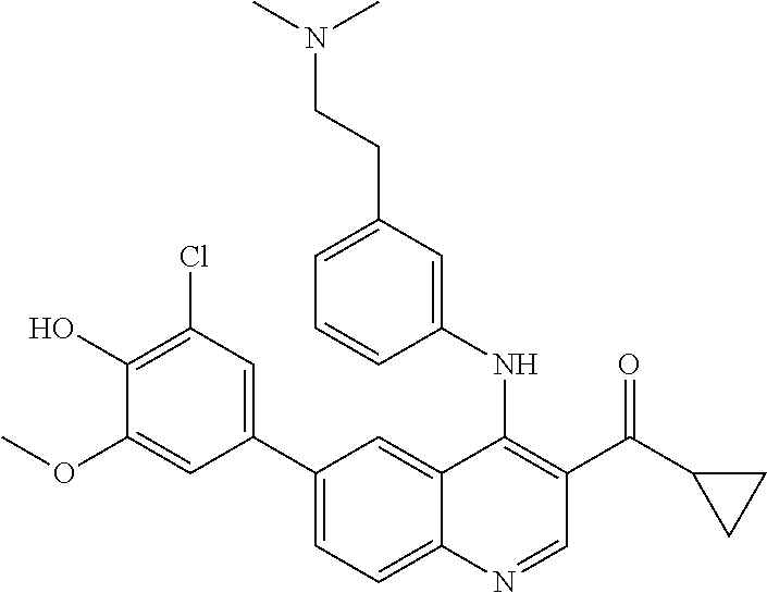 - PEAZQTKOWOEYCZ-UKIBZPOASA-N C1C[C@@H](CN(C)C)CC[C@@H]1NC1=C(C(=O)C2CC2)C=NC2=CC=C(C=3C=C(Cl)C(O)=C(Cl)C=3)C=C12 Chemical compound C1C[C@@H](CN(C)C)CC[C@@H]1NC1=C(C(=O)C2CC2)C=NC2=CC=C(C=3C=C(Cl)C(O)=C(Cl)C=3)C=C12 PEAZQTKOWOEYCZ-UKIBZPOASA-N 0.000 claims description 3