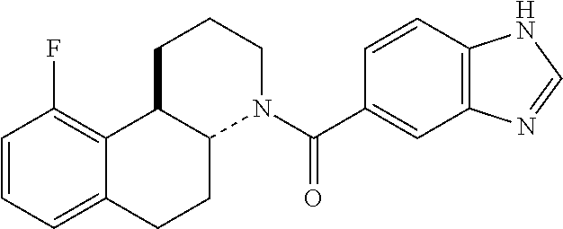 (4a-R,9a-S)-1-(1H-Benzoimidazole-5-carbonyl)-7-methyl-2,3,4,4a,9,9a-hexahydro-1H-indeno[2,1-b]pyridine-6-carbonitrile (174) and (4a-S,9a-R)-1-(1H-Benzoimidazole-5-carbonyl)-7-methyl-2,3,4,4a,9,9a-hexahydro-1H-indeno[2,1-b]pyridine-6-carbonitrile (175) (the Absolute Configuration of the Two Compounds is Arbitrarily Assigned)