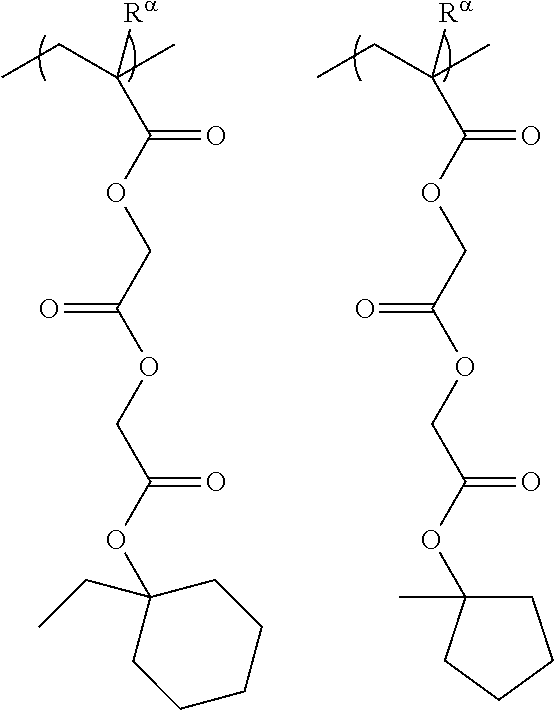 The acrylate ester may have the hydrogen atom bonded to the carbon atom on the α-position substituted with a substituent. The substituent (Rα0) that substitutes the hydrogen atom bonded to the carbon atom on the α-position is an atom other than hydrogen or a group, and examples thereof include an alkyl group of 1 to 5 carbon atoms and a halogenated alkyl group of 1 to 5 carbon atoms. Further, an acrylate ester having the hydrogen atom bonded to the carbon atom on the α-position substituted with a substituent (Rα0) in which the substituent has been substituted with a substituent containing an ester bond (e.g., an itaconic acid diester), or an acrylic acid having the hydrogen atom bonded to the carbon atom on the α-position substituted with a substituent (Rα0) in which the substituent has been substituted with a hydroxyalkylgroup or a group in which the hydroxy group within a hydroxyalkyl group has been modified (e.g., α-hydroxyalkyl acrylate ester) can be mentioned as an acrylate ester having the hydrogen atom bonded to the carbon atom on the α-position substituted with a substituent. A carbon atom on the α-position of an acrylate ester refers to the carbon atom bonded to the carbonyl group, unless specified otherwise.