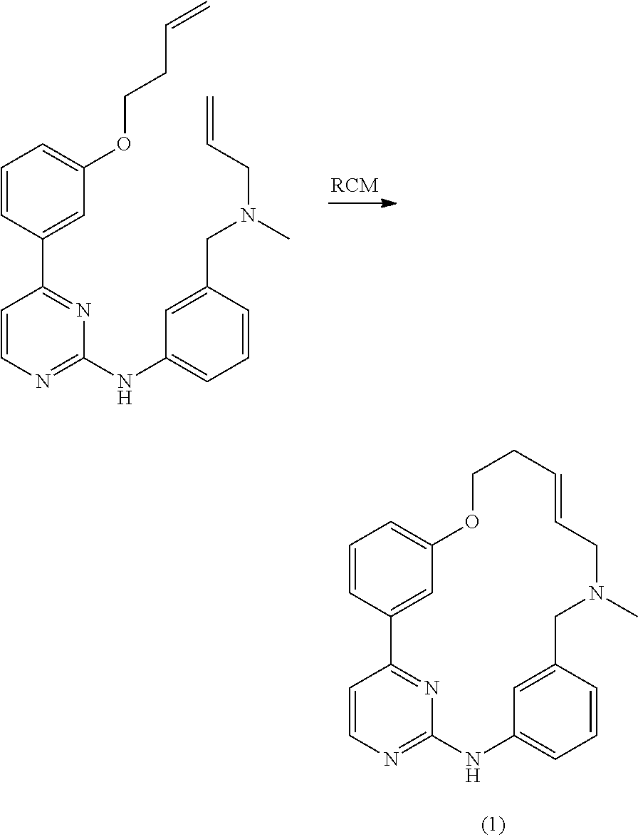 The recombinant enzymes (CDK2/CyclinA, FLT3, JAK2 and JAK2 V617F) were purchased from Invitrogen (Cat #PV3267, 3182, 4210 and 4347 respectively). All assays were carried out in 384-well white microtiter plates using the PKLight assay system from Cambrex (East rutherford, N.J.). This assay platform is essentially a luminometric assay for the detection of ATP in the reaction using a luciferase-coupled reaction. For CDK2/Cyclin A assay, the reaction mixture consisted of the following components in 25 assay buffer (50 mM Hepes pH 7.5, 10 mM MgCl2, 5 mM MnCl2, 5 mM BGP, 1 mM DTT, 0.1 mM sodium orthovanadate), 1.4 μg/mL of CDK2/Cyclin A complex, 0.5 μM of RbING substrate (Invitrogen, Cat #PV2939) and 0.5 μM of ATP. The compounds were tested at 8 concentrations prepared from 4-fold serial dilution starting at 10 μM. The reaction was incubated at room temperature for 2 hr. 13 μL of PKLight ATP detection reagent was added and the reaction was incubated for 10 min. Luminescence signals were detected on a multi-label plate reader (Victor2 V 1420, Perkin-Elmer). The other kinase assays were identical except for the following differences in reagents. For FLT3 assays, the reaction contained 2.0 μg/mL FLT3 enzyme, 5 μM of poly(Glu,Tyr) substrate (Sigma, Cat #P0275) and 4 μM of ATP. For JAK2 assays, the reaction contained 0.6 μg/mL of JAK2 enzyme, 2 μM of poly(Glu,Ala,Tyr) substrate (Sigma, Cat #P3899) and 0.2 μM of ATP. For JAK2 V617F mutant assays, the reaction contained 8.0 μg/mL of JAK2 mutant enzyme, 2 μM of poly(Glu,Ala,Tyr) substrate (Sigma, Cat #P3899) and 0.2 μM of ATP. The analytical software, Prism 4.0 (GraphPad Software Pte Ltd) was used to generate IC50 values from the data. IC50 is defined as the concentration of compound required for 50% inhibition of kinase enzyme activity. IC50 values are shown below in Table 3.