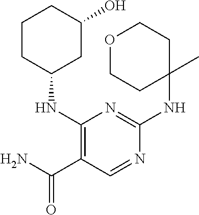 (1R,4r)-4-(5-cyano-4- ((1R,3R,4R)-3-hydroxy-4- methylcyclohexylamino)- pyrimidin-2-ylamino)-N,N- dimethyl-cyclohexane- carboxamide |