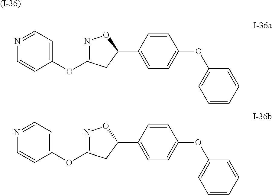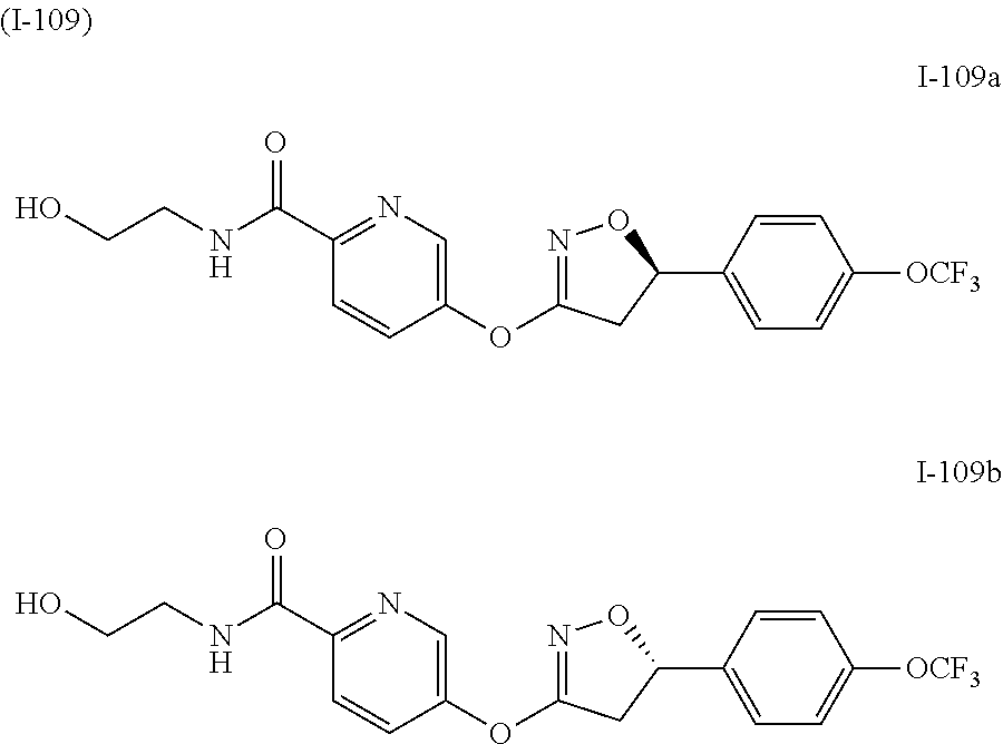 3-(pyridin-3-yloxy)-4,5-dihydroisoxazole I-236a and I-236b were prepared in 3 steps according to the following procedures: racemic dihydroisoxazole I-161 (1.0 equiv) was dissolved in N,N-dimethylforamide (0.1 M). Copper iodide (1.0 equiv) was added followed by trimethylsilylacetylene (3.0 equiv) and N,N-diisopropyl ethylamine (2.0 equiv). Palladium tetrakis (15 mol %) was added and the reaction was sealed and heated in a microwave reactor at 100° C. for 1 h. The reaction was allowed to cool after which it was transferred to a separatory funnel with ethyl acetate and water. The organic layer was then washed with water and brine, dried over sodium sulfate, concentrated and purified by flash silica gel chromatography (gradient ethyl acetate/hexanes). The TMS group was then deprotected by dissolving this material in methanol (0.07 M) and adding potassium carbonate (3.0 equiv). After stirring for 4 h at room temperature, the reaction was transferred a separatory funnel with ethyl acetate and water. The organic layer was then washed with water and brine, dried over sodium sulfate, concentrated and purified by flash silica gel chromatography (gradient ethyl acetate/hexanes). The resulting alkyne was then converted to the desired triazole by first dissolving it in neat trimethyl silylazide (80 equiv), purging the reaction mixture with Argon and heating in a microwave reactor to 110° C. for 3 h. After an additional 4 h of heating the reaction was 60% complete by LC/MS analysis at which point it was concentrated and purified directly by flash silica gel chromatography (gradient methanol/methylene chloride) to provide the desired racemic triazole I-236. These compounds can be separated using chiral HPLC methods known in the art. For example, see chiral HPLC Method disclosed herein. [M+H]+=392.9 m/z. Activity: A