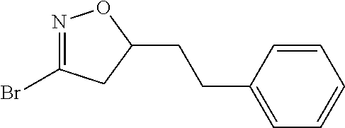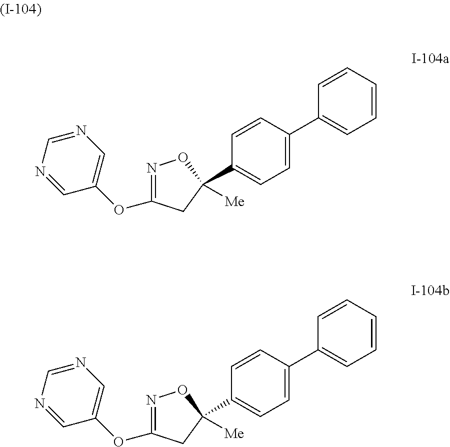 3-(phenylsulfinyl)-4,5-dihydroisoxazole I-249a and I-249b were prepared by the oxidation of racemic 3-(phenylthio)-4,5-dihydroisoxazole I-248. 3-(Phenylthio)-4,5-dihydroisoxazole I-248 (1.0 equiv) was dissolved in ethanol (0.15 M) followed by the addition of excess hydrogen peroxide in water (30% by weight, >50 equiv) and 1N HCl (0.29 M). The reaction was stirred at room temperature for 14 h after which it was transferred to a separatory funnel with excess water and methylene chloride. The water layer was extracted with methylene chloride (1×), dried over magnesium sulfate, and concentrated to provide crude product that was recrystallized from hexanes to provide the desired racemic 3-(phenylsulfinyl)-4,5-dihydroisoxazole I-249. These compounds can be separated using chiral HPLC methods known in the art. For example, see chiral HPLC Method disclosed herein. [M+H]+=355.5 m/z. Activity: C