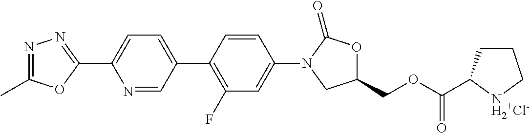- 56) (R)-3-(4-(2-(2-methyl-[1,3,4]oxadiazol-5-yl)pyridin-5-yl)-3-fluorophenyl)-5-(L-prolinyloxy)methyl oxazolidin-2-on hydrochloride,