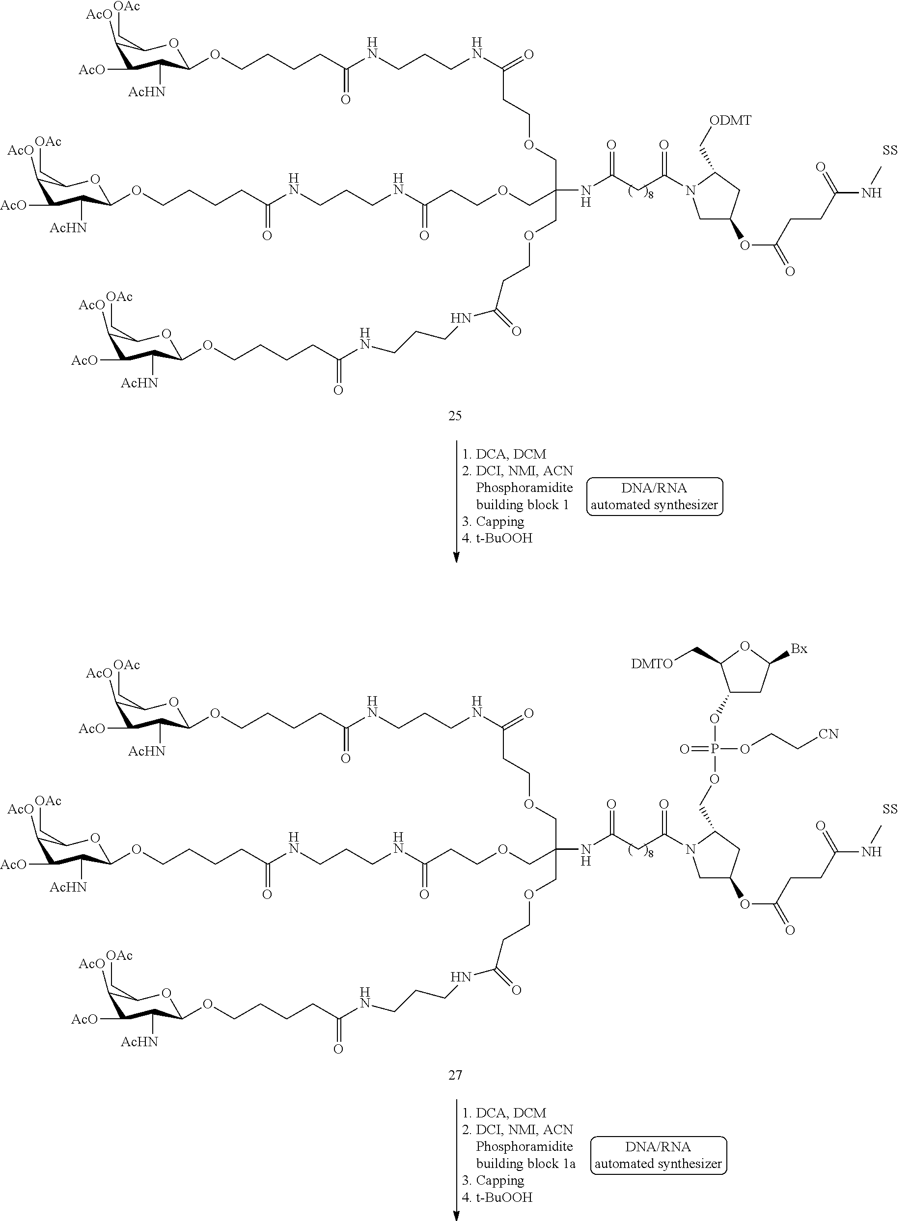 In view of the art and the present disclosure, one of ordinary skill can easily make any of the conjugates and conjugated oligonucleotides herein. Moreover, synthesis of certain such conjugates and conjugated oligonucleotides disclosed herein is easier and/or requires few steps, and is therefore less expensive than that of conjugates previously disclosed, providing advantages in manufacturing. For example, the synthesis of certain conjugate groups consists of fewer synthetic steps, resulting in increased yield, relative to conjugate groups previously described. Conjugate groups such as GalNAc3-10 in Example 46 and GalNAc3-7 in Example 48 are much simpler than previously described conjugates such as those described in U.S. Pat. No. 8,106,022 or U.S. Pat. No. 7,262,177 that require assembly of more chemical intermediates. Accordingly, these and other conjugates described herein have advantages over previously described compounds for use with any oligonucleotide, including single-stranded oligonucleotides and either strand of double-stranded oligonucleotides (e.g., siRNA).