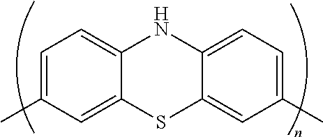 Properties of charge/discharge characteristics of various conductive polymers in lithium secondary battery assemblies are disclosed in NISHIO, Koji, et al. Characteristics of a lithium secondary battery using chemically-synthesized electrical conductive polymers. Journal of Power Sources. 1991, vol. 34, p. 153-160. In this investigation, a polyphenothiazine polymer of formula
