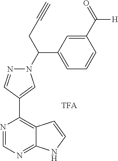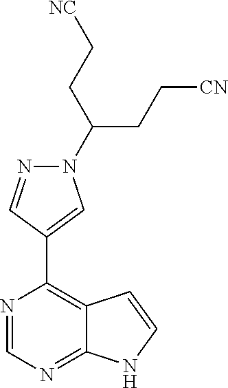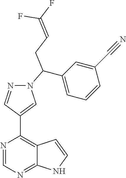 To a mixture of (2E)- and (2Z)-3-1-[(benzyloxy)methyl]cyclopentylacrylonitrile (generated in Step 4) and 4-(1H-pyrazol-4-yl)-7-[2-(trimethylsilyl)ethoxy]methyl-7H-pyrrolo[2,3-d]pyrimidine (0.037 g, 0.12 mmol) in ACN (1.5 mL) was added DBU (18 μL, 0.12 mmol). The resulting mixture was stirred at ambient temperature for 3 hours, and then was heated to 60° C. for 28 hours. The reaction mixture was diluted with diethyl ether and 0.1 N HCl. The layers were separated and the aqueous layer was extracted with ethyl acetate. The ethyl acetate extract was washed with brine, dried over sodium sulfate, decanted, and the solvent was removed in vacuo. The resulting residue was dissolved in DCM (3 mL) and TFA (0.75 mL), and this solution was stirred for 3 hours. The solvents were removed in vacuo, and the resulting residue was dissolved in THF (5 mL) and 6.0 M sodium hydroxide in water (3 mL) and stirred for 2 hours. The reaction mixture was extracted with three portions of ethyl acetate. The combined extracts were washed with brine, dried over sodium sulfate, decanted, and the solvent was removed in vacuo. The crude mixture was purified by preparative-HPLC/MS (C18 eluting with a gradient of H2O and ACN containing 0.1% TFA) and lyophilized to afford the desired product (10 mg, 20% over the two steps).