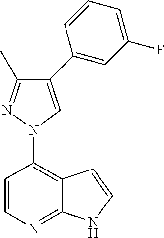 The above cell lines can also be used to examine the effects of compounds on phosphorylation of JAK kinases or potential downstream substrates such as STAT proteins, Akt, Shp2, or Erk. These experiments can be performed following an overnight cytokine starvation, followed by a brief preincubation with compound (2 hours or less) and cytokine stimulation of approximately 1 hour or less. Proteins are then extracted from cells and analyzed by techniques familiar to those schooled in the art including Western blotting or ELISAs using antibodies that can differentiate between phosphorylated and total protein. These experiments can utilize normal or cancer cells to investigate the activity of compounds on tumor cell survival biology or on mediators of inflammatory disease. For example, with regards to the latter, cytokines such as IL-6, IL-12, IL-23, or IFN can be used to stimulate JAK activation resulting in phosphorylation of STAT protein(s) and potentially in transcriptional profiles (assessed by array or qPCR technology) or production and/or secretion of proteins, such as IL-17. The ability of compounds to inhibit these cytokine mediated effects can be measured using techniques common to those schooled in the art.