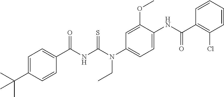 The present invention also provides a compound selected from the group consisting of: N-[4-[(4-tert-butylbenzoyl)-carbamothioylamino]-2-hydroxy-phenyl]-2-chloro-benzamide; 4-tert-butyl-N-[[4-[(2-chlorophenyl)-methylamino]-3-methoxy-phenyl]-carbamothioyl]-benzamide; N-[2-amino-4-[(4-tert-butylbenzoyl)-carbamothioylamino]-phenyl]-2-chloro-benzamide hydrochloride; N-[(4-benzamido-2-chloro-phenyl)carbamothioyl]-4-tert-butyl-benzamide; 4-tert-butyl-N-[[4-[(2-chlorobenzene-carbothioyl)amino]-3-methoxy-phenyl]-carbamothioyl]benzamide; 4-(aminomethyl)-N-[4-[(4-tert-butylbenzoyl)-carbamothioylamino]-2-methoxy-phenyl]benzamide hydrochloride; N-[4-[(4-tert-butylbenzene-carboximidoyl)-carbamothioylamino]-2-methoxy-phenyl]-2-chloro-benzamide; 4-tert-butyl-N-[[4-[(2-chlorobenzene-carboximidoyl)amino]-3-methoxy-phenyl]-carbamothioyl]benzamide; 3-(aminomethyl)-N-[4-[(4-tert-butylbenzoyl)-carbamothioylamino]-2-methoxy-phenyl]benzamide hydrochloride; 2-amino-N-[4-[(4-tert-butylbenzoyl)-carbamothioylamino]-2-methoxy-phenyl]benzamide; N-[4-[(4-tert-butylbenzoyl)-carbamothioylamino]-2-methoxy-phenyl]pyridine-3-carboxamide; N-[4-[(4-tert-butylbenzoyl)-carbamothioylamino]-2-methoxy-phenyl]pyridine-4-carboxamide; N-[[4-[(4-aminobenzoyl)amino]-3-methoxy-phenyl]-carbamothioyl]-4-tert-butyl-benzamide hydrochloride; and N-[4-[(4-tert-butylbenzoyl)-carbamothioyl-ethyl-amino]-2-methoxy-phenyl]-2-chloro-benzamide.