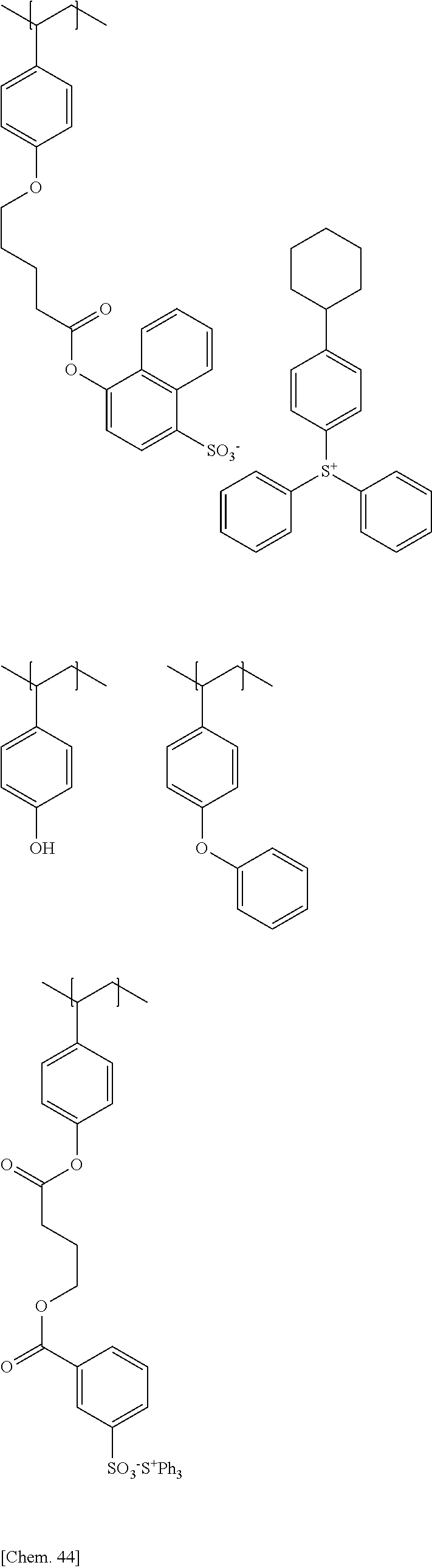 (2) the polymer compound (A) contains, as the repeating unit (a), only (a2) a repeating unit having an ionic structural moiety capable of producing an onium cation in the side chain upon irradiation with an actinic ray or radiation (that is, an embodiment where only an onium cation is introduced into the side chain of the polymer compound (A) through a covalent bond); and