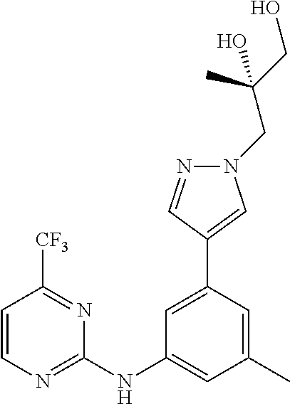 A solution of (5-{[4-(3-{[4-(difluoromethyl)pyrimidin-2-yl]amino}-5-methylphenyl)-1H-pyrazol-1-yl]methyl}-2-oxo-1,3-oxazolidin-4-yl)methyl trifluoroacetate (80 mg, 0.15 mmol) and potassium carbonate (80 mg, 0.58 mmol) in methanol (3 mL) was stirred at 25° C. for 30 minutes. The reaction mixture was diluted with water and extracted with ethyl acetate. The organic layer was dried over sodium sulfate, filtered, and concentrated under reduced pressure to afford the crude product residue. The crude product residue was purified by prep-TLC (ethyl acetate) to give racemic 5-{[4-(3-{[4-(difluoromethyl)pyrimidin-2-yl]amino}-5-methylphenyl)-1H-pyrazol-1-yl]methyl}-4-(hydroxymethyl)-1,3-oxazolidin-2-one. MS ESI calc'd. for C20H21F2N6O3 [M+H]+ 431. found 431.
