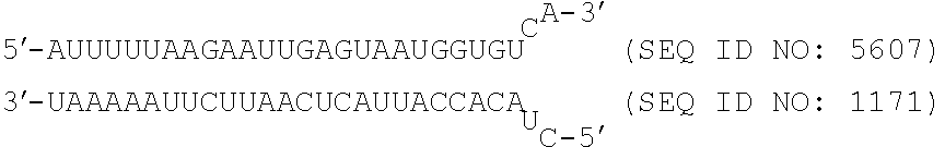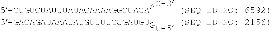 In an additional embodiment, the dsRNA includes a pair of first strand/second strand sequences as shown for a DsiRNA agent of Tables 2-4, 6, 9 or 11.