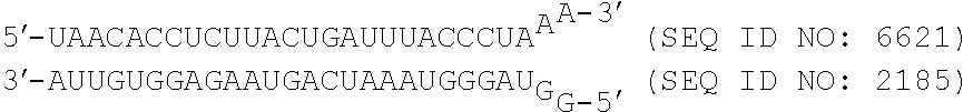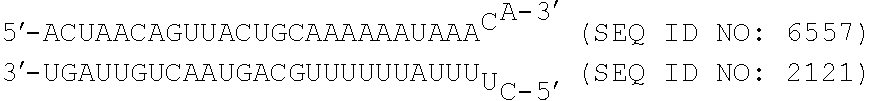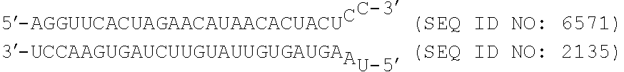 In one embodiment, the first strand includes a sequence of SEQ ID NOs: 5553-6661.