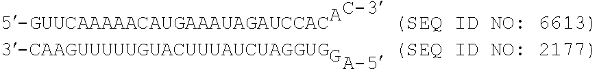 In an additional embodiment, the dsRNA includes a pair of first strand/second strand sequences as shown for a DsiRNA agent of Tables 2-3, 6-9 and 11-13.