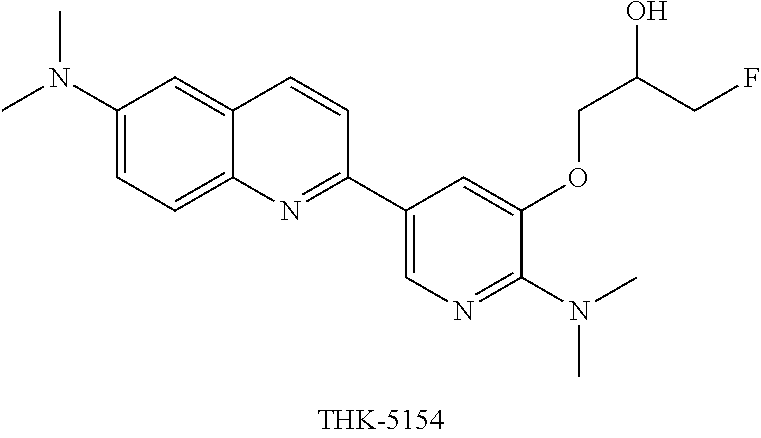 Table 4 shows % ID/g values at 2 minutes and at 60 minutes post-administration, and values of the % ID/g values at 2 minutes post-administration divided by those at 60 minutes post-administration. Labeled probes which target an intended histopathology in the brain, need to be incorporated rapidly into the brain and to be rapidly washed out from histopathologies that are not their intended histopathology. [18F] THK-5105, [18F] THK-5117 and [18F] THK-5125 exhibited a sufficient intracerebral content at 2 minutes post-administration, and the quotients of their intracerebral contents at 2 minutes post-administration and 60 minutes post-administration were greater than those for [18F] BAY94-9172 and [18F] AV-45, which are known as amyloid imaging probes, and that for [18F] FDDNP. Form these results, it turned out that [18F] THK-5105, [18F] THK-5117, and [18F] THK-5125 were superior in being delivered to and washed out from the brain. (The data of [18F] BAY94-9172 was taken from Zhang et al., Nuclear Medicine and Biology, 32, 799-809, 2005, and the data of [18F] AV-45 from Choi et al., J Nucl Med, 50, 1887-1894, 2009.)