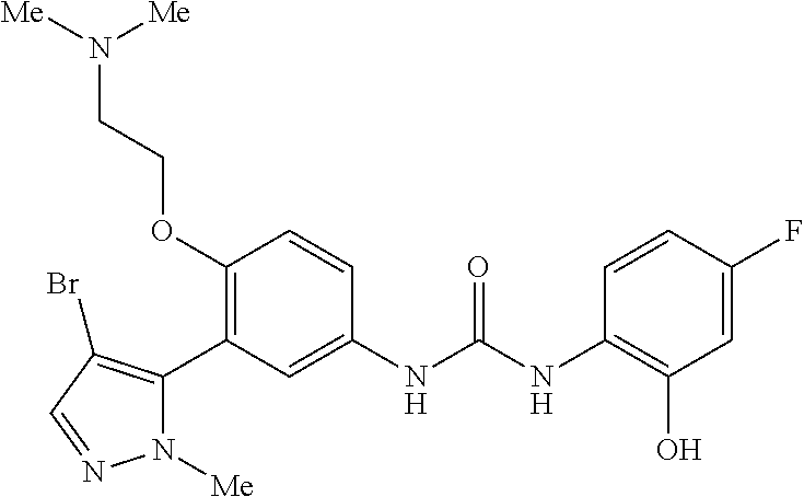 FIGS. 16A-C provide grey-scale representative autoradiographic sections from this study. FIG. 16A evidences darker bands (derived from 125I-LSD binding) primarily in both the fourth layer of the cerebral cortex (primarily 5HT2A receptors), and the caudate nucleus (primarily dopamine D2 receptors and some 5HT2A receptors). As can be seen from FIG. 16B, spiperone, which is a 5HT2A and dopamine D2 antagonist, displaces the I125-LSD from these receptors on both the cortex and the caudate. As can be further seen from FIG. 16C, Compound S-1610, [3-(4-Bromo-2-methyl-2H-pyrazol-3-yl)-phenyl]-carbamic acid 4-methoxy-phenyl ester, appears to selectively displace the 125I-LSD from the cortex (5HT2A) and not the caudate (dopamine D2).