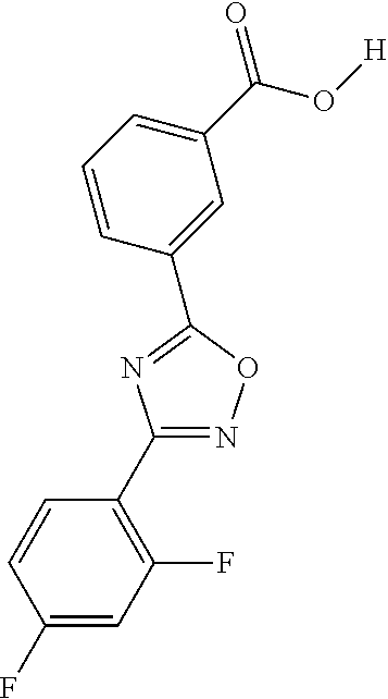 At each dose level, it is recommended that 3-[5-(2-fluoro-phenyl)-[1,2,4]oxadiazol-3-yl]-benzoic acid be taken TID at 6-, 6-, and 12-hour (±˜30 minutes) intervals. Ideally each dose is taken within ˜30 minutes after a meal (e.g., ˜7:00 AM after breakfast, ˜1:00 PM after lunch, and ˜7:00 PM after dinner). While it is realized that variations in dosing schedule may occur in the outpatient setting, it is recommended that the prescribed regimen (including dosing intervals and the relationship of dosing to meals) be followed closely on the days of PK sample collection. Clinical endpoints are evaluated using the procedures set forth above.
