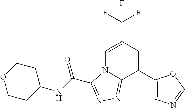 - OEIJTJIKBWSWET-UHFFFAOYSA-N C12COCC(N1C(=O)C1=CN=C3N1C=C(C=C3C3=CN=CO3)C(F)(F)F)C2 Chemical compound C12COCC(N1C(=O)C1=CN=C3N1C=C(C=C3C3=CN=CO3)C(F)(F)F)C2 OEIJTJIKBWSWET-UHFFFAOYSA-N 0.000 claims description 4