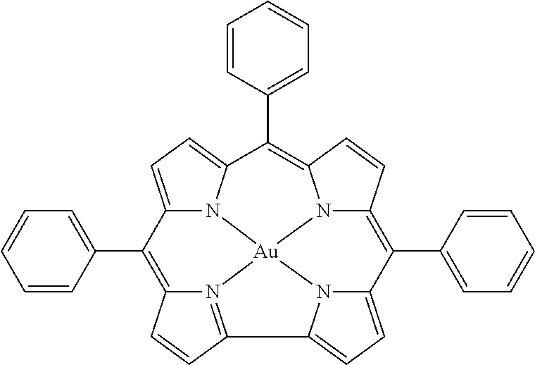 In one embodiment, the total number of carbon atoms provided by the R1-R15 groups is 0. In another embodiment, the total number of carbon atoms provided by the R1-R15 groups is from 1 to 40. In yet another embodiment, the total number of carbon atoms provided by the R1-R15 groups is from 2 to 20. In one embodiment, in the gold corrole compound the R1-R15 groups are all hydrogen. In another embodiment, in the gold corrole compound the R1-R15 groups are all either hydrogen or halogen. In yet another embodiment, in the gold corrole compound the R1-R15 groups are all either hydrogen or alkyl groups.