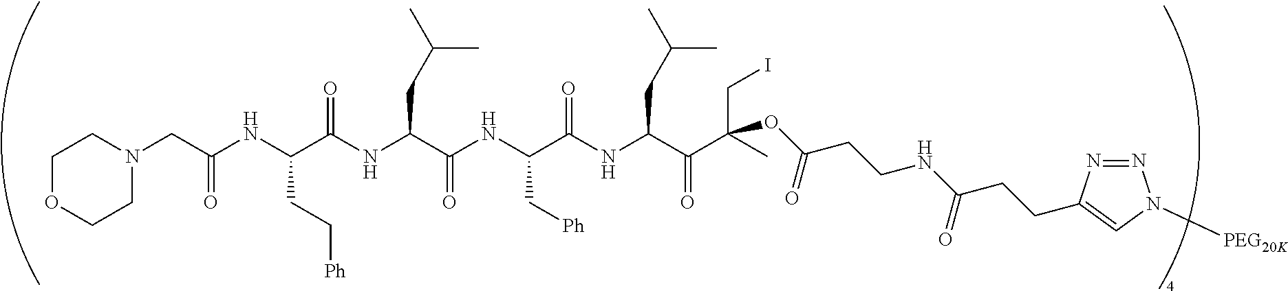 FIG. 43 is a scheme showing the synthesis of an embodiment of an iodohydrin ester prodrug of an epoxy ketone proteasome inhibitor conjugated to a multi-arm PEG.