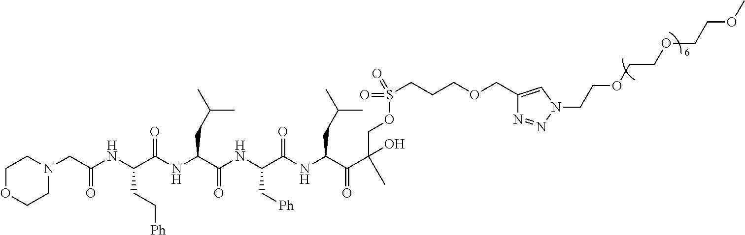 FIG. 15 is a scheme showing the conjugation of a PEG of molecular weight between 1-40 kDa onto a sulfonate-containing epoxy ketone proteasome inhibitor prodrug.
