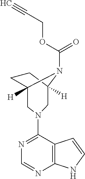 - FAOGFKZYDUNKBI-UHFFFAOYSA-N phenyl-[3-(7h-pyrrolo[2,3-d]pyrimidin-4-yl)-3,8-diazabicyclo[3.2.1]octan-8-yl]methanone Chemical compound C1N(C=2C=3C=CNC=3N=CN=2)CC2CCC1N2C(=O)C1=CC=CC=C1 FAOGFKZYDUNKBI-UHFFFAOYSA-N 0.000 claims description 6