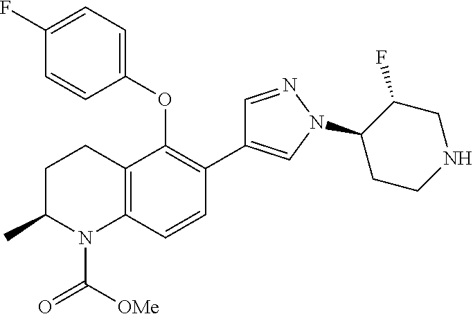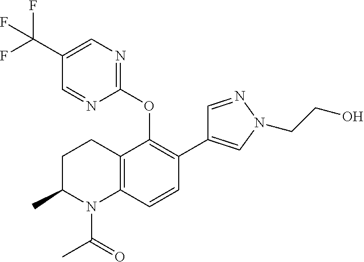 The impact of Example compounds on cancer cell proliferation was determined using the acute myelocytic leukemia (AML) cell line MV4-11 (ATCC) in a 3-day proliferation assay. MV4-11 cells were maintained in RPMI 1640 media supplemented with 10% FBS at 37° C. and an atmosphere of 5% CO2. For compound testing, compound dilutions series were prepared in DMSO via a 3-fold serial dilution from 2 mM to 0.001 mM in 384-well white flat bottom plates. The final compound concentrations in the wells were 10, 3.3, 1.1, 0.37, 0.12, 0.041, 0.013 and 0.0045 μM. MV4-11 cells were plated at a density of 3000 cells/well in final volume of 50 μl culture media and incubated for 72 hours. The amounts of viable cells were determined using the CellTiter-Glo Luminescent Cell Viability Assay kit (Promega) according to the manufacturer suggested protocol. Luminescent signal from the CellTiter-Glo assay was read on an EnVision multilabel plate reader (PerkinElmer). Values for the concentration that inhibited cell growth by 50% (gIC50) between the DMSO control and background control (no cells) were determined using IDBS Activity Base software with a four parameter logistic curve fit by the equation y=A+((B−A)/(1+((C/x)^D))), wherein A denotes the bottom plateau of the curve, B denotes the top plateau of the curve, C denotes the x value at the middle of the curve, D denotes the slope factor, x denotes the original known x values, and y denotes the original known y values. Data was fitted using the Levenburg Marquardt algorithm.