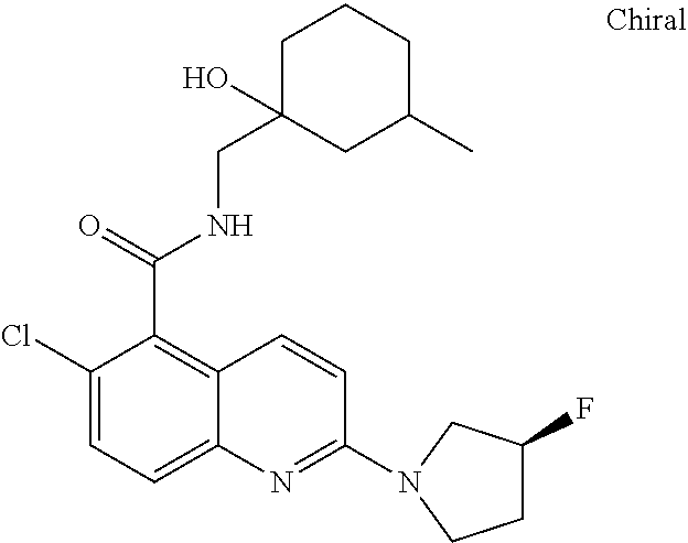 - 6-chloro-N-{[(1S,3S)-1-hydroxy-3-methylcyclohexyl]methyl}-2-(3-hydroxy-3-methylpyrrolidin-1-yl]quinoline-5-carboxamide.