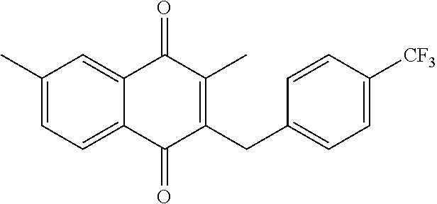 They are given in FIG. 1. The most effective compounds in killing Plasmodium falciparum are the 6- and 7-substituted naphthoquinones, in particular the 6- and the 7-fluoro menadione analogues, DAL54 and EC060, of the lead compounds P_TM24 or P_TM29, and the pyridinyl-4-methyl-substituted menadione LJ186. These compounds were found more active than chloroquine or as active as P_TM29 in assays using the multi-resistant P. falciparum strain Dd2. Using the Kochi-Anderson reaction from structurally diverse phenyl acetic acids, 4-pyridylacetic acid and polysubstituted menadiones, synthesized according the present processes of preparation, the preparation of various 3-benzyl menadiones derivatives, substituted at 6- and 7- of the menadione core, and pyridinyl-4-methyl-substituted menadione LJ186 analogues was applied.