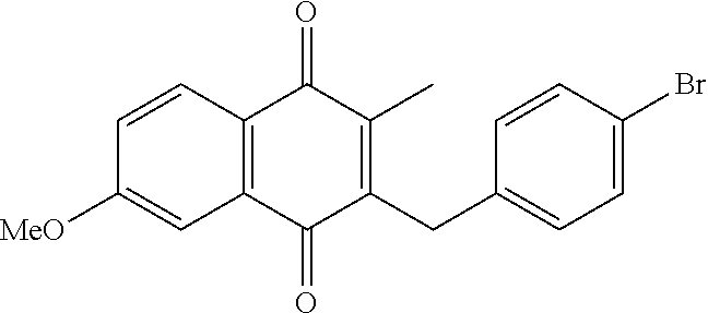 Finally, putative metabolites of the antiparasitic (substituted-benzyl)menadione and (substituted-benzyl)azamenadione derivatives, generated from a cascade of redox reactions (FIG. 2), were synthesized. They are illustrated with the benzoyl-naphthoquinones and benzxanthones. They were tested in assays using the chloroquine-sensitive P. falciparum strain 3D7. The potential metabolite LJ144K was found to display significant antimalarial effects with IC50 values in submicromolar range. The methylated precursors did not show antimalarial effects in the same range.