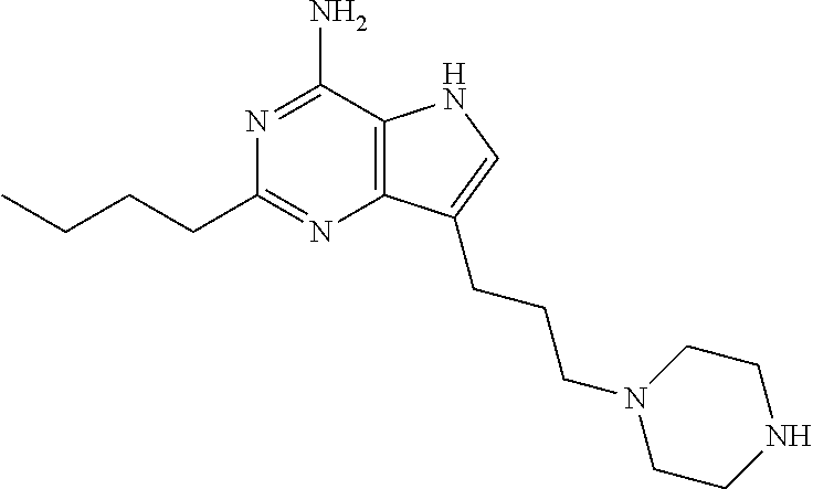 - IICIEXFIYJLTBL-UHFFFAOYSA-N CCCCc1nc(N)c2[nH]cc(CCCN3CCN(CC)CC3)c2n1 Chemical compound CCCCc1nc(N)c2[nH]cc(CCCN3CCN(CC)CC3)c2n1 IICIEXFIYJLTBL-UHFFFAOYSA-N 0.000 description 1