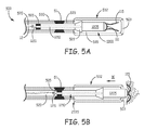 FIGS. 5A-B are partial cut-away section views of a distal portion of an interventional medical system that includes a delivery tool, like the tool of FIGS. 3A-B, according to some alternate embodiments and methods;