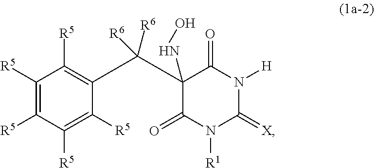(5.) The N-hydroxylaminobarbituric acid type compound of the above (1.), wherein said compound has a half-life from about 15 minutes to about 3900 minutes when measured under the conditions described in Example 17.